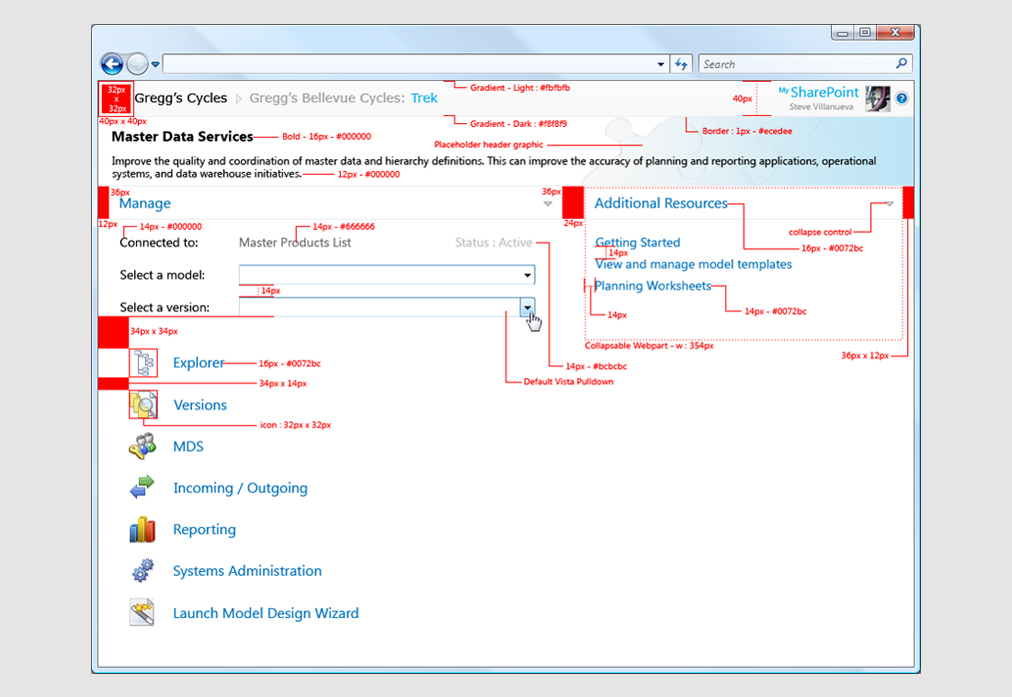 Microsoft defines Master Data Services as the ability to manage a master set of your organization's data. You can organize the data into models, create rules for updating the data, and control who updates the data. With Excel, you can share the master data set with other people in your organization. Originally purchased from a 3rd party by Microsoft, MDS was to be packaged as an option that would ship with SQL Server. Because the original team that developed the product had no design experience, the product as it was when purchased was extremely Web 1.0 in it's interface design (or lack thereof). SQL Group wanted to make MDS look as if it were a Microsoft Office product, and that's where I came in.