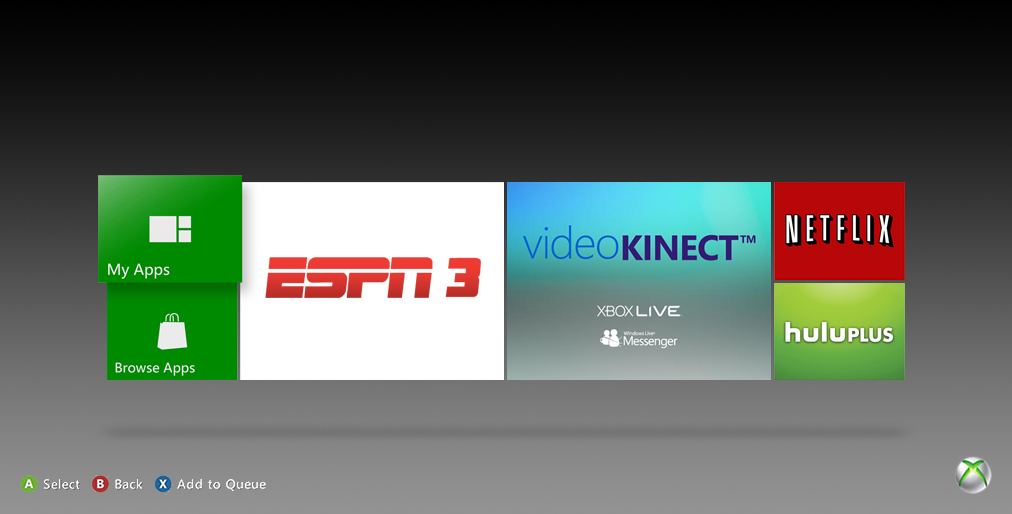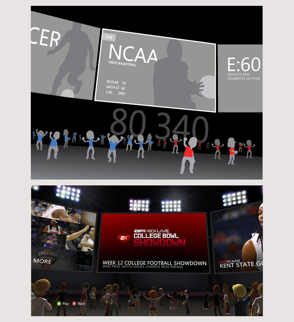 My role was in designing menus for applications such as ESPN, Hulu, Netflix, Xbox Video Chat, Kumo Chat, Zune and many others. These menus could seamlessly slide from side to side, and individual cells could parallax to create an astounding 3D effect. This required the use of flow-charts and motion studies to implement the menus using vector elements and timeline animations.