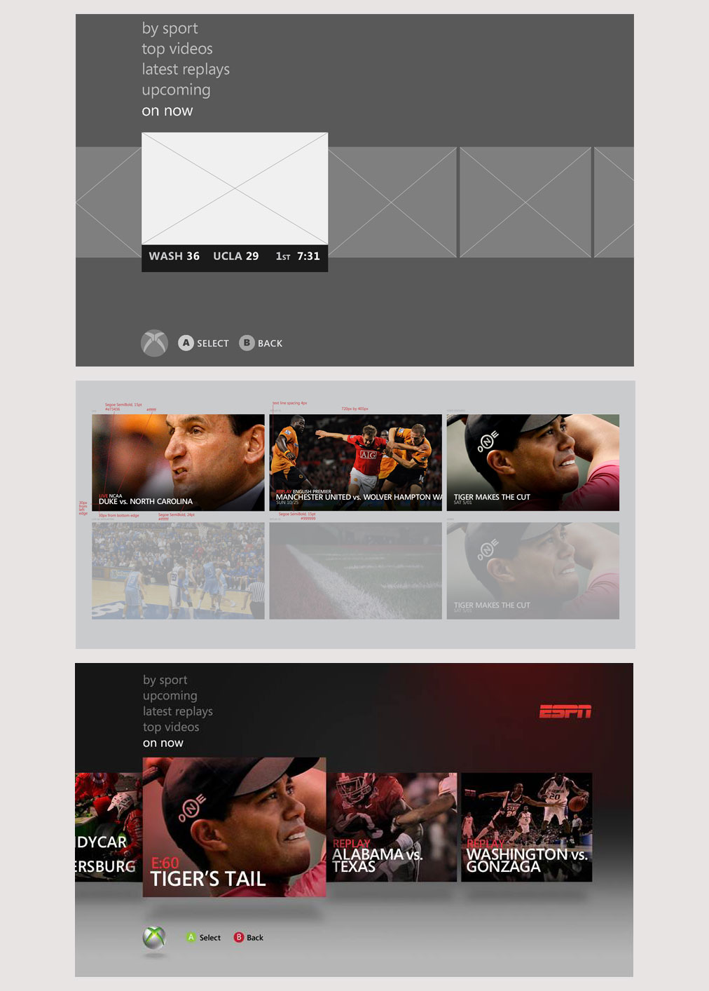 While I worked on many apps, one of the biggest ones was the ESPN app. My specific contribution was to research interactions, animations, and transitions through the above mentioned UX Research process. The following examples show the rotating viewing room I helped to design. I also designed and animated the animated text, and the exploding tiles on the far-left view-screen.