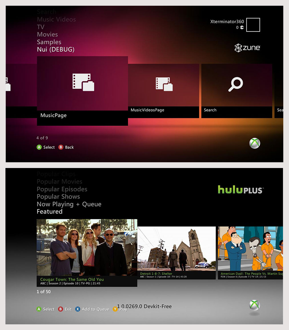 I also had a significant contribution to both Hulu and Zune apps. Not only did I work on designing these apps, but they revolutionized my own personal, at-home entertainment experience. I dumped my cable TV not long after this, and started watching all my shows on Hulu, Netflix, Vudu, and other video apps.