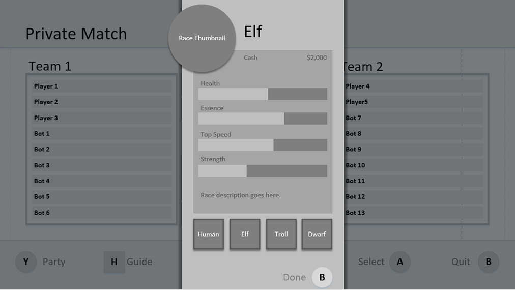 My role was as a UI Artist, UI Designer, and UX Researcher in charge of researching UX principals, designing UI elements, and implementing the in-game and game-setup interface elements, such as the overall screens, transitions from screen to screen, dialogs, buttons, sliders, and other vector elements.